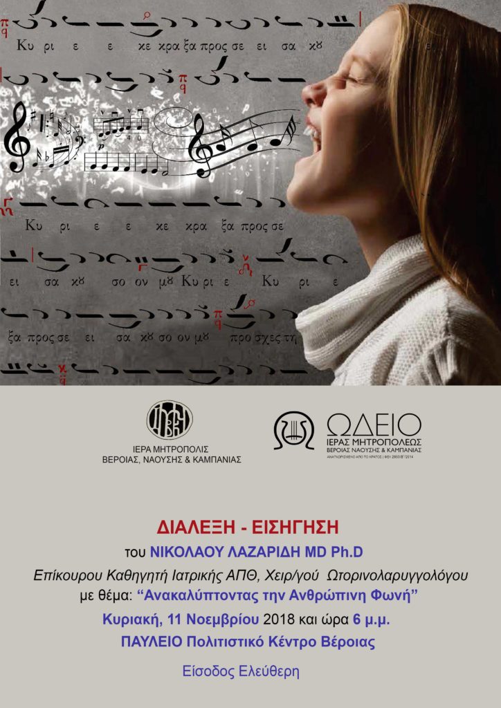 Η ανθρώπινη φωνή θα βρεθεί στο επίκεντρο στη Βέροια. Πιο συγκεκριμένα στην Ιερά Μητρόπολη Βεροίας, Ναούσης και Καμπανίας θα λάβει χώρα διάλεξη – εισήγηση με θέμα: “ΑΝΑΚΑΛΥΠΤΟΝΤΑΣ ΤΗΝ ΑΝΘΡΩΠΙΝΗ ΦΩΝΗ” που θα πραγματοποιηθεί την Κυριακή 11 Νοεμβρίου και ώρα 6 μ.μ. στο ΠΑΥΛΕΙΟ Πολιτιστικό Κέντρο της Ιεράς Μητροπόλεως (πλησίον του βήματος του Απ. Παύλου) στην Βέροια από τον Επίκουρο Καθηγητή Ιατρικής ΑΠΘ, Χειρουργό Ωτορινολαρυγγολόγο κ. Νικολάου Λαζαρίδη. Η Ενημερωτική Ημερίδα απευθύνεται σε όλους όσους ασχολούνται με την φωνή : Ιερείς, Ιεροψάλτες, Τραγουδιστές, Καθηγητές, Δασκάλους, Δικηγόρους κλπ. Στο τέλος της εισήγησης θα ακολουθήσει συζήτηση. Η είσοδος είναι ελεύθερη.