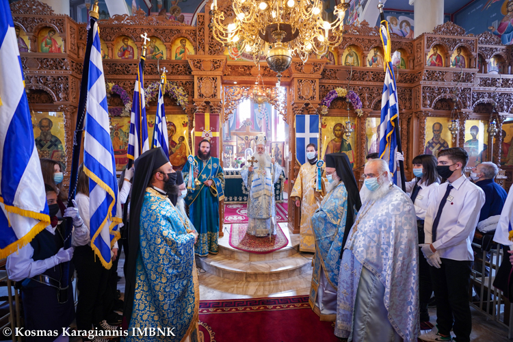 Ἡ σημερινή λαμπρή καί χαρμόσυνη ἡμέρα τῶν Ἐλευθερίων τῆς πόλεώς μας μᾶς καλεῖ νά κάνουμε καί ἐμεῖς τό χρέος μας ἔναντι τοῦ Θεοῦ, τῆς πατρίδος καί τῶν συνανθρώπων μας, ἄν θέλουμε νά εἴμεθα ἄξιοι τῆς ἐλευθερίας πού μέ τόσες θυσίες καί μέ τή βοήθεια τοῦ Θεοῦ καί τῆς Ὑπεραγίας Θεοτόκου, τῆς Ὑπερμάχου Στρατηγοῦ τοῦ Γένους μας, μᾶς χάρισαν οἱ πατέρες μας. Ἄς φανοῦμε ἀντάξιοί τους!
