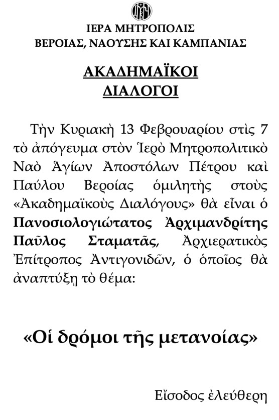 11/02/2022 11/02/2022 Το θέμα: «Οι δρόμοι της μετανοίας» θα αναπτύξει ο Πανοσιολογιώτατος Αρχιμανδρίτης Παύλος Σταματάς, Αρχιερατικός Επίτροπος Αντιγονιδών στον Ιερό Μητροπολιτικό Ναό Αγίων Αποστόλων Πέτρου και Παύλου Βεροίας, την Κυριακή 13 Φεβρουαρίου στις 7 το απόγευμα.