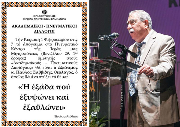 Την Κυριακή 1 Φεβρουαρίου στις 7 το απόγευμα στο Πνευματικό Κέντρο της Ιεράς Μητροπόλεως Βεροίας, Ναούσης και Καμπανίας (Βενιζέλου 29, 1ος όροφος) ομιλητής στους «Ακαδημαικούς – Πνευματικούς Διαλόγους» θα είναι ο αξιότιμος κ. Παύλος Σαββίδης, θεολόγος, ο οποίος θα αναπτύξει το θέμα: «Η εξάδα που εξυψώνει και εξαϋλώνει».