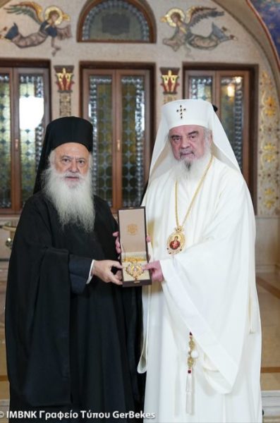 Μετά την απονομή ο Σεβασμιώτατος αφού εξέφρασε τις θερμές του ευχαριστίες για την πρόσκληση και την φιλοξενία, καθώς επίσης για την απονομή του οφικίου προσέφερε στον Μακαριώτατο μία εικόνα του Οσίου Γερασίμου του Υμνογράφου, αφού η Εκκλησία της Ρουμανίας έχει αφιερώσει την φετινή χρονιά στους Υμνογράφους και Μελωδούς της Ορθοδόξου Εκκλησίας. Επίσης, προσέφερε το αναμνηστικό των ΚΘ´ Παυλείων καθώς και το αρχιερατικό εγκόλπιο των ΚΘ´ Παυλείων. Επίσης, εκ μέρους του Σωματείου Παναγία Σουμελά προσέφερε έναν τόμο με φωτογραφίες κειμηλίων από τα υπόγεια της Αγίας Σοφίας στην Κωνσταντινούπολη.