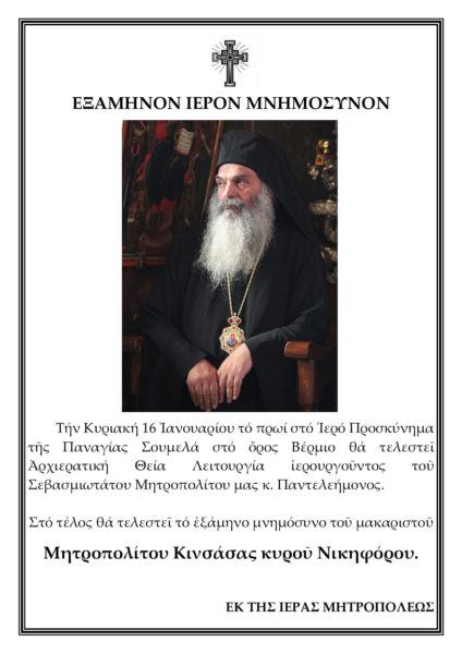 Στο τέλος θα τελεστεί το εξάμηνο μνημόσυνο του μακαριστού Μητροπολίτου Κινσάσας κυρού Νικηφόρου, πνευματικού αδελφού του Σεβασμιωτάτου Μητροπολίτου κ. Παντελεήμονος.