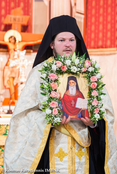 Ἀνταποκρινόμενοι καί ἐμεῖς στήν πρόσκληση τοῦ ἱεροῦ ὑμνογράφου τιμοῦμε τήν ἀνακομιδή τῶν λειψάνων ἑνός ἀπό τούς νεωτέρους ἁγίους τῆς Ἐκκλησίας μας, ἐδῶ, στόν ναό τῶν ἁγίων Κωνσταντίνου καί Ἑλένης, στόν ὁποῖο πρό διετίας τελέσαμε τά θυρανοίξια παρεκκλησίου ἐπ᾽ ὀνόματι τοῦ ἁγίου Ἀμφιλοχίου, καί στό ὁποῖο θά φυλάσσεται στό ἑξῆς τμῆμα τοῦ ἱεροῦ καί χαριτοβρύτου λειψάνου του πού εἴχαμε τή μεγάλη εὐλογία νά ὑποδεχθοῦμε μέ πολύ σεβασμό καί κατάνυξη πρό ὀλίγου.