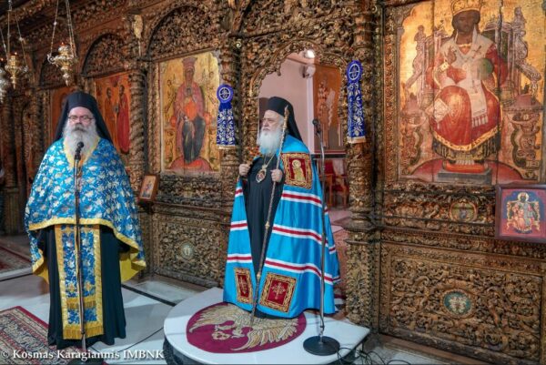 Καί μαζί μέ τίς εὐχαριστίες μας, μαζί μέ τά ἐγκώμια τῶν ἱερῶν ὑμνογράφων, μέ τά ὁποῖα κατα­στέ­φουμε τή χάρη της, τῆς ἀπευ­θύναμε πρίν ἀπό λίγο καί μία κατα­λη­κτή­ρια ἱκεσία, μία ἱκεσία πού ἀφορᾶ τό παρόν καί τό μέλ­λον, τό δικό μας ἀλλά καί ὅλων τῶν ἀνθρώ­πων.
