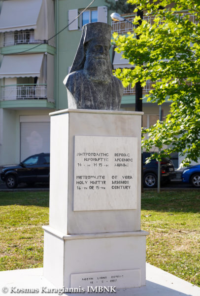 Αὐτό συνέβη καί μέ τόν ἅγιο ἱερομάρτυρα Ἀρσένιο, τόν ὁποῖο συνέλαβαν οἱ Τοῦρκοι μαζί μέ ἄλλους Βεροιεῖς καί τόν ὁδήγησαν ἀρχικά στή φυλακή, ὅπου τόν ὑπέβαλαν σέ φρικτά βασανιστήρια. Ὅμως ἐκεῖνος ὄχι μόνο τά ὑπέμενε καρτερικά, ἀλλά καί ἐνίσχυε τούς συγκρατουμένους του, ὥστε νά μήν δειλιάσουν καί ἀρνηθοῦν τήν πίστη. Καί ὅταν οἱ Τοῦρκοι εἶδαν ὅτι δέν πρόκειται νά ἀρνηθεῖ τόν Χριστό, τότε τόν ὁδήγησαν στό μαρτύριο. Σύμφωνα μάλιστα μέ μία παράδοση τόν κρέμασαν στόν πλάτανο πού βρίσκεται ἔξω ἀπό τόν ναό μας καί ἄφησαν στή συνέχεια ἄταφο τό σῶμα του γιά νά γίνει βορά τῶν πτηνῶν καί τῶν ζώων. Κατά θαυμαστό ὅμως τρόπο παρέμεινε ἀνέπαφο, σύμφωνα μέ τόν λόγο τοῦ ψαλμωδοῦ Δαβίδ ὅτι «φυλάσσει Κύριος πάντα τά ὀστᾶ αὐτῶν», τῶν δικαίων δηλαδή, «ἕν ἐξ αὐτῶν οὐ συντριβήσεται», μέχρι τή στιγμή πού εὐλαβεῖς Βεροιεῖς πῆραν τό ἱερό λείψανό του καί τό ἐνεταφίασαν μέ τίς ἁρμόζουσες τιμές.