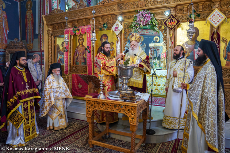 Στο τέλος της θείας λειτουργίας ο Σεβασμιώτατος τέλεσε αγιασμό και ανέγνωσε την ευχή του Αγίου Τρύφωνος για τους αγρούς.
