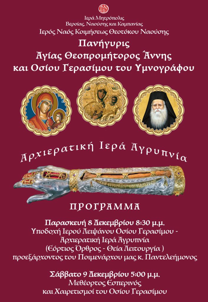 Η Ιερά Μητρόπολη Βεροίας, Ναούσης και Καμπανίας ανακοινώνει στο χριστεπώνυμο πλήρωμα της τοπικής Εκκλησίας ότι την Παρασκευή 8 Δεκεμβρίου στις 8:30 μ.μ. στον Ιερό Ναό Κοιμήσεως της Θεοτόκου Ναούσης θα πραγματοποιηθεί η υποδοχή του Ιερού Λειψάνου του Οσίου Γερασίμου του Υμνογράφου.