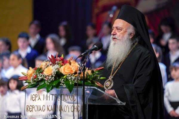 Εὐχαριστῶ θερμότατα τή μεγάλη παιδική σχολική χορωδία Βεροίας, μέ τούς 170 μαθητές, πού μᾶς τραγούδησαν τόσο ὄμορφα καί τόσο ἐνθουσιαστικά ἀλλά καί συγκινητικά, «ἐκ στόματος νηπίων καί θηλαζόντων κατηρτίσω αἶνον», ὅπως λέγει ἡ Γραφή, ὑπό τή διεύθυνση τῆς διακεκριμένης μουσικοῦ καί χοράρχου κ. Ἑλένης Ἀναγνώστου, καί τά μέλη τοῦ Λυκείου Ἑλληνίδων Βεροίας πού μᾶς μετέφεραν στήν ἐποχή τῆς Ἐπαναστάσεως τοῦ 1821, χορεύοντας παραδοσιακούς χορούς ἀπό τό Ρουμλούκι.