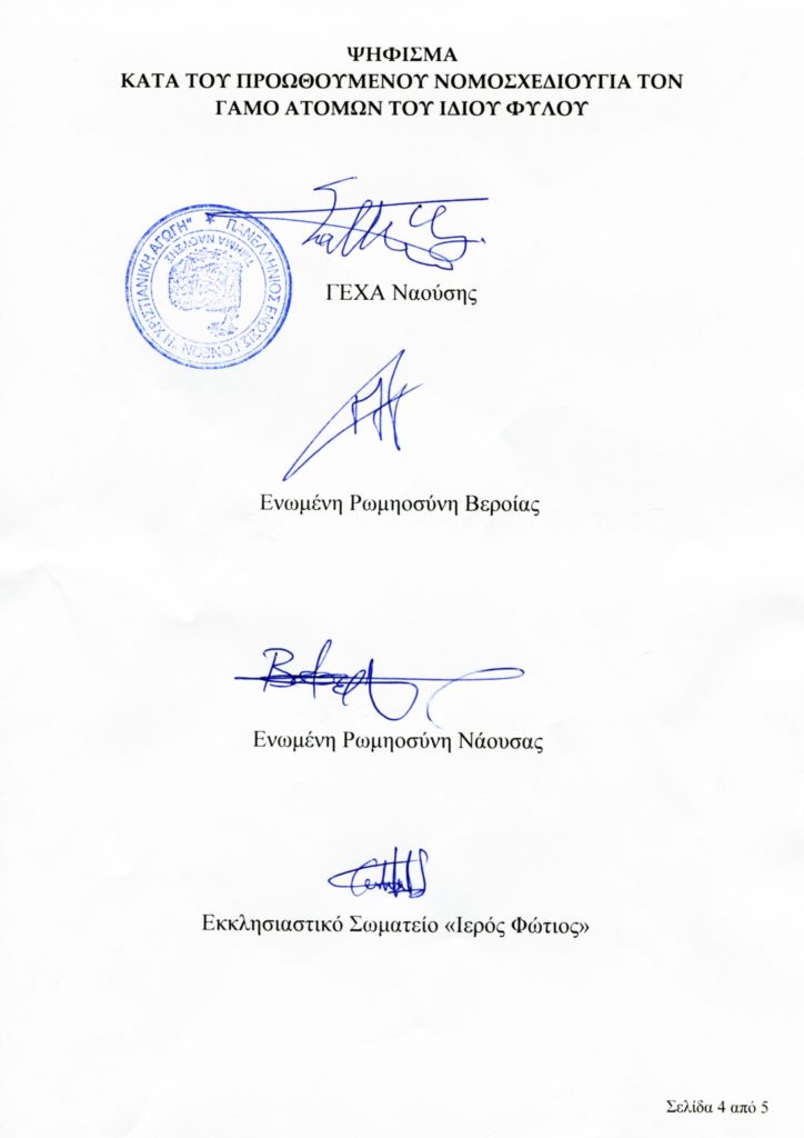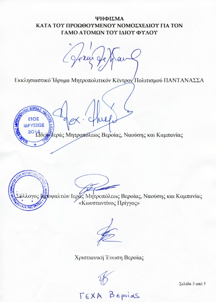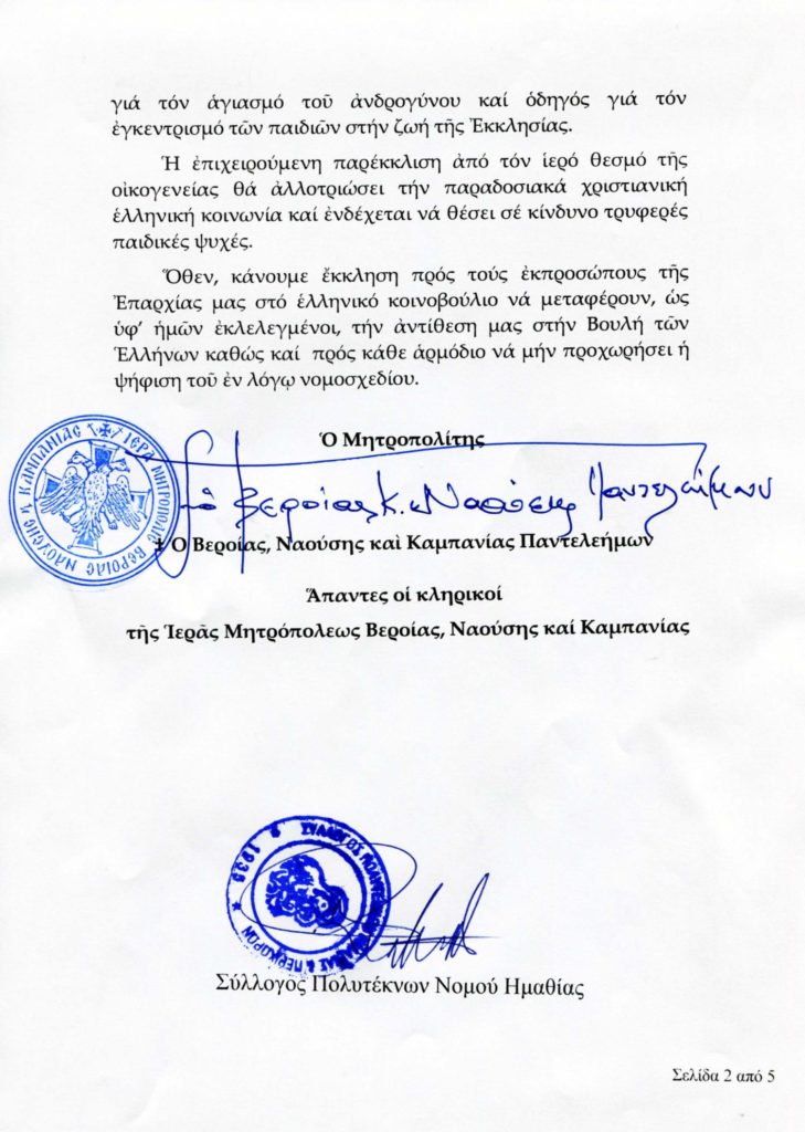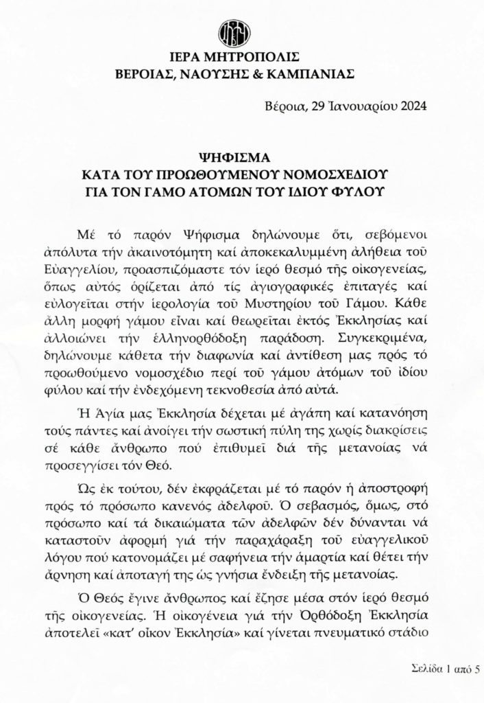 Με ψήφισμά της, η Ιερά Μητρόπολη Βεροίας, Ναούσης και Καμπανίας δηλώνει την κάθετη διαφωνία και αντίθεσή της προς το προωθούμενο νομοσχέδιο περί του γάμου ατόμων του ιδίου φύλου και την ενδεχόμενη τεκνοθεσία από αυτά.