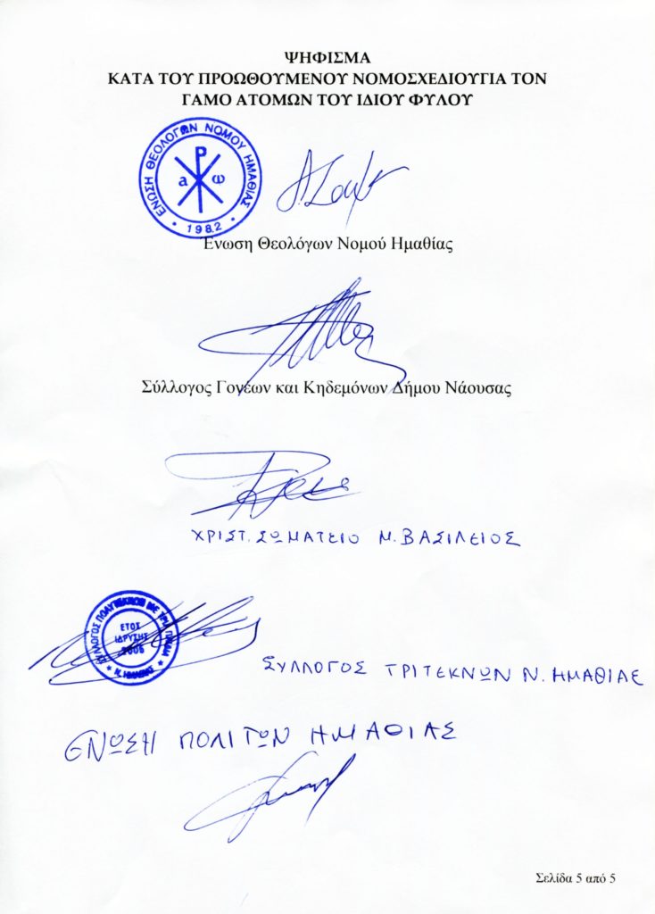 “Σεβόμενοι απόλυτα την ακαινοτόμητη και αποκεκαλυμμένη αλήθεια του Ευαγγελίου, προασπιζόμαστε τον ιερό θεσμό της οικογενείας, όπως αυτός ορίζεται από τις αγιογραφικές επιταγές και ευλογείται στην ιερολογία του Μυστηρίου του Γάμου. Κάθε άλλη μορφή γάμου είναι και θεωρείται εκτός Εκκλησίας και αλλοιώνει την ελληνορθόδοξη παράδοση. Συγκεκριμένα, δηλώνουμε κάθετα την διαφωνία και αντίθεση μας προς το προωθούμενο νομοσχέδιο περί του γάμου ατόμων του ιδίου φύλου και την ενδεχόμενη τεκνοθεσία από αυτά”, όπως αναφέρεται μεταξύ άλλων.