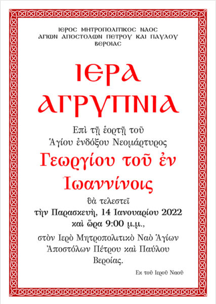 Η Ιερά Μητρόπολη Βεροίας, Ναούσης και Καμπανίας θα τελέσει σήμερα Ιερά Αγρυπνία επί τη εορτή του Αγίου ενδόξου Νεομάρτυρος Γεωργίου του εν Ιωαννίνοις στις 9:00 μ.μ. στον Μητροπολιτικό Ναό Αγίων Αποστόλων Πέτρου και Παύλου Βεροίας.