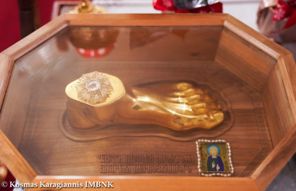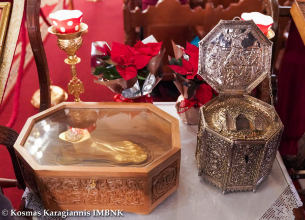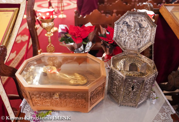 Στην Ιερά Ακολουθία τέθηκαν σε προσκύνηση Ιερά Λείψανα του Αποστόλου Ανδρέου του Πρωτοκλήτου και το χαριτόβρυτο Ιερό Λείψανο του Αγίου Λουκά του Ιατρού που αποθησαυρίζονται στην Ιερά Μονή της Παναγίας Δοβρά, καθώς και τεμάχιο Ιερού Λειψάνου της Αγίας Μεγαλομάρτυρος Αικατερίνης της Πανσόφου από την ιστορική Ιερά Μονή των Αγίων Αναργύρων Νησίου.