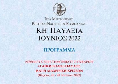 Tο πρόγραμμα του Διεθνούς Επιστημονικού Συνεδρίου των ΚΗ’ Παυλείων με θέμα: «Ο Απόστολος Παύλος και η διαχείριση των κρίσεων», που θα πραγματοποιηθεί στο Χώρο Τεχνών και στην Αντωνιάδειο Στέγη Γραμμάτων και Τεχνών του Δήμου Βεροίας το τριήμερο 26, 27 και 28 Ιουνίου έδωσε στη δημοσιότητα η Ιερά Μητρόπολη Βεροίας, Ναούσης και Καμπανίας.