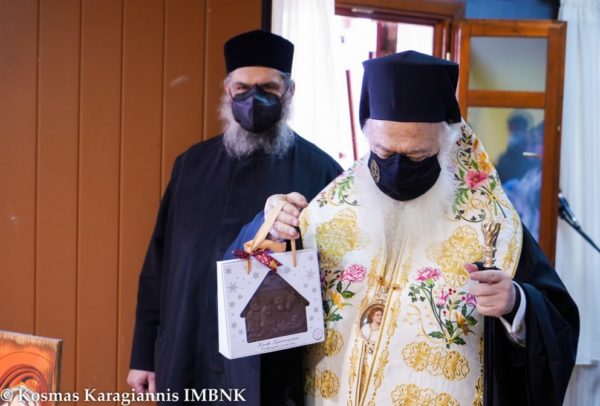Ο Σεβασμιώτατος, κατά την επίσκεψή του το μεσημέρι της Πέμπτης 13 Ιανουαρίου, απηύθυνε πατρικούς λόγους και ευχές, παρέδωσε οικονομική ενίσχυση για τις ανάγκες του Κέντρου και μοίρασε συμβολικά δώρα σε όλα τα παιδιά, καθώς επίσης και χριστουγεννιάτικες σοκολάτες με τη Γέννηση του Χριστού προσφορά της Ιεράς Μονής Αγίων Πάντων Βεργίνης.