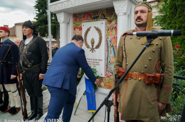 Στο τέλος του Εσπερινού ο Δήμαρχος ηρωικής πόλεως Ναούσης κ. Νικόλαος Κουτσογιάννης κατέθεσε στεφάνι στο μνημείο των Ηρώων και των Αγίων της Ναούσης που βρίσκεται στον αύλειο χώρο του Ιερού Ναού του Αγίου Γεωργίου.