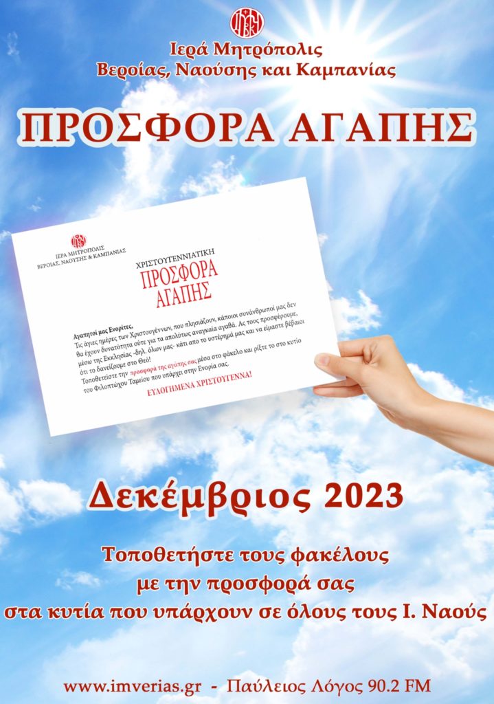 Eτήσια Σύναξη των μελών των Ενοριακών Φιλοπτώχων Ταμείων της Iεράς Μητροπόλεως Βεροίας , Ναούσης και Καμπανίας πραγματοποιήθηκε το απόγευμα της Πέμπτης 7ης Δεκεμβρίου 2023, στον Ιερό Ναό του Οσίου Αντωνίου του Νέου, Πολιούχου Βεροίας, με την ευκαιρία της ενάρξεως της «Χριστουγεννιάτικης προσφοράς αγάπης 2023».