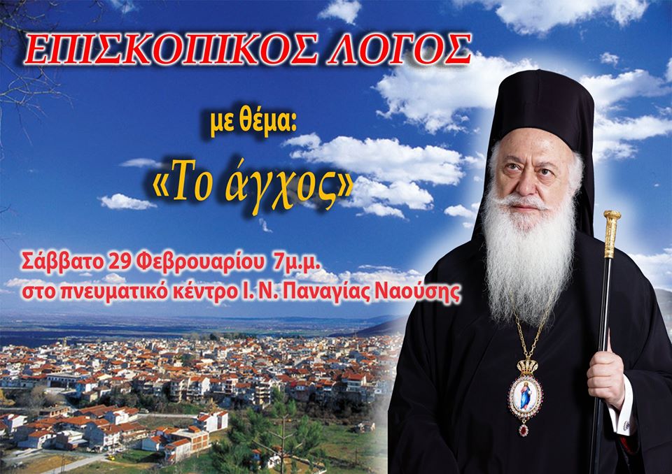 Το Σάββατο 29 Φεβρουαρίου στις 7:00 μ.μ. στο Πνευματικό Κέντρο του Ιερού Ναού Κοιμήσεως της Θεοτόκου Ναούσης o Σεβασμιώτατος Μητροπολίτης Βεροίας, Ναούσης και Καμπανίας κ. Παντελεήμων θα ομιλήσει με θέμα: «Το άγχος» στο πλαίσιο των συνάξεων «Επισκοπικός Λόγος».