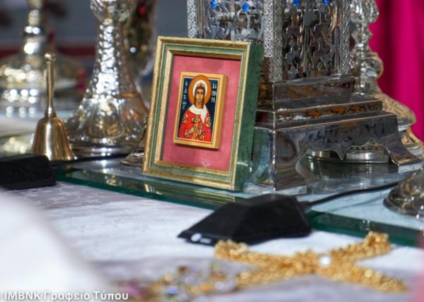Κατά τη διάρκεια του Όρθρου και της θείας Λειτουργίας τέθηκαν σε προσκύνηση αποτμήματα ιερών Λειψάνων της Αγίας.