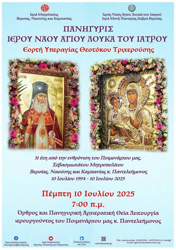 Με αισθήματα πνευματικής χαράς και αγαλλιάσεως τη 10η Ιουλίου 2025, ο Ιερός Ναός του Αγίου Λουκά του Ιατρού στην Ιερά Μονή Παναγίας Δοβρά Βεροίας, θα εορτάσει την εορτή της εν Δοβρά συνάξεως της Ιεράς Εικόνος της Παναγίας Τριχερούσης.