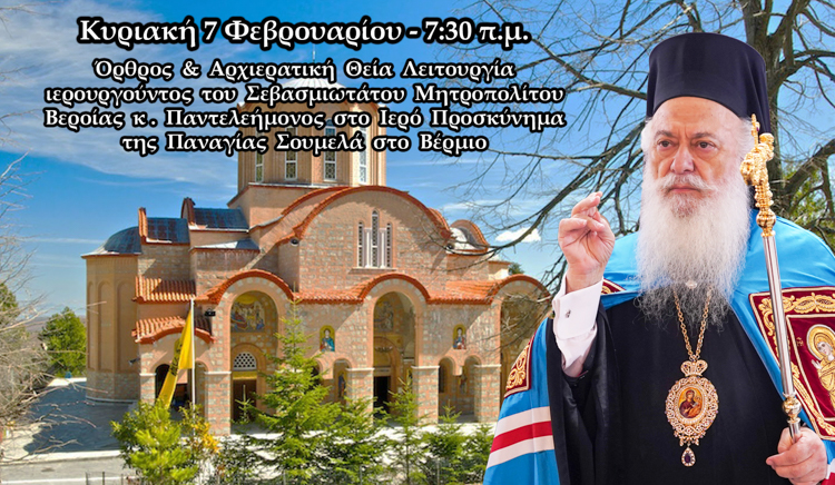 Γίνεται γνωστό στους ευλαβείς χριστιανούς της Τοπικής Εκκλησίας ότι την Κυριακή 7 Φεβρουαρίου το πρωί ο Σεβασμιώτατος Μητροπολίτης Βεροίας, Ναούσης και Καμπανίας κ. Παντελεήμων θα ιερουργήσει και θα κηρύξει το θείο λόγο στο Ιερό Προσκύνημα της Παναγίας Σουμελά στο όρος Βέρμιο.