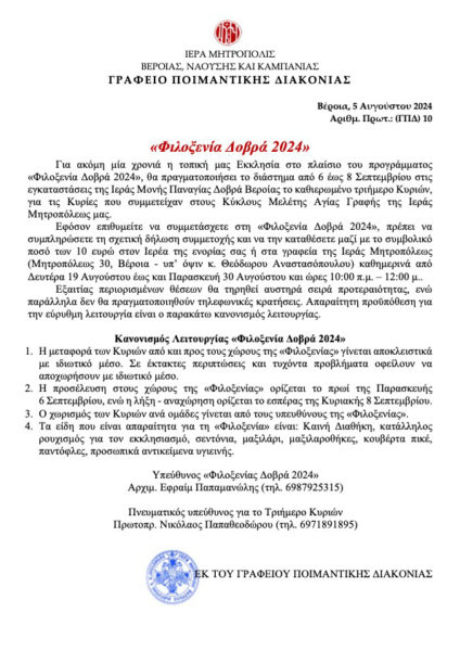 05/08/2024 05/08/2024 Η Ιερά Μητρόπολις Βεροίας, Ναούσης και Καμπανίας θα πραγματοποιήσει στο πλαίσιο του προγράμματος «Φιλοξενία Δοβρά 2024» το καθιερωμένο τριήμερο κυριών, για τις κυρίες που συμμετείχαν στους Κύκλους Μελέτης Αγίας Γραφής και στα Εσπερινά Κηρύγματα των ενοριών της Μητροπόλεως Βεροίας. Το τριήμερο θα πραγματοποιηθεί το διάστημα 6, 7 και 8 Σεπτεμβρίου στις εγκαταστάσεις της Ιεράς Μονής...