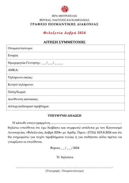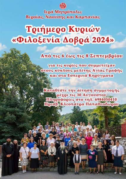 Η Ιερά Μητρόπολις Βεροίας, Ναούσης και Καμπανίας θα πραγματοποιήσει στο πλαίσιο του προγράμματος «Φιλοξενία Δοβρά 2024» το καθιερωμένο τριήμερο κυριών, για τις κυρίες που συμμετείχαν στους Κύκλους Μελέτης Αγίας Γραφής και στα Εσπερινά Κηρύγματα των ενοριών της Μητροπόλεως Βεροίας.