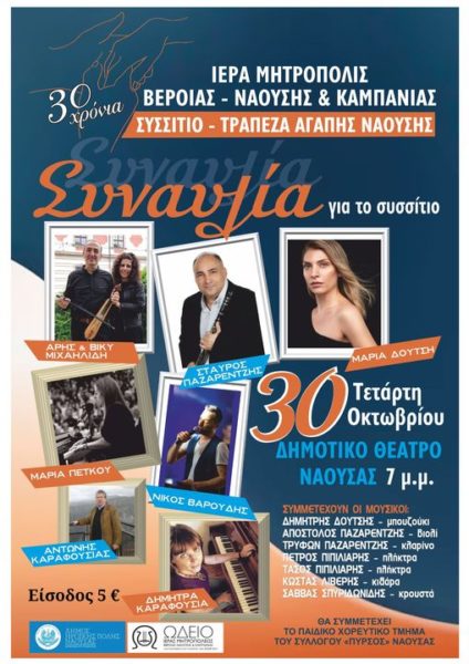 Το Συσσίτιο – Τράπεζα Αγάπης Ναούσης σε συνεργασία με το Ωδείο της Ιεράς Μητροπόλεως και υπό την αιγίδα της Ιεράς Μητροπόλεως Βεροίας, Ναούσης και Καμπανίας και του Δήμου Ηρωικής Πόλεως Ναούσης διοργανώνει Συναυλία Αλληλεγγύης με σκοπό την ενίσχυση του Συσσιτίου, καθώς και για τα 30 χρόνια συνεχούς λειτουργίας του.
