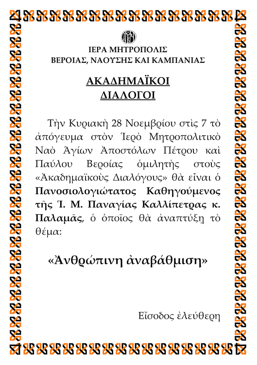 Tην Κυριακή 28 Νοεμβρίου στις 7 το απόγευμα στον Ιερό Μητροπολιτικό Ναό Αγίων Αποστόλων Πέτρου και Παύλου Βεροίας ομιλητής στους «Ακαδημαικούς Διαλόγους» θα είναι ο Πανοσιολογιώτατος Καθηγούμενος της Ι. Μ. Παναγίας Καλλίπετρας π. Παλαμάς, ο οποίος θα αναπτύξει το θέμα: «Ανθρώπινη αναβάθμιση».