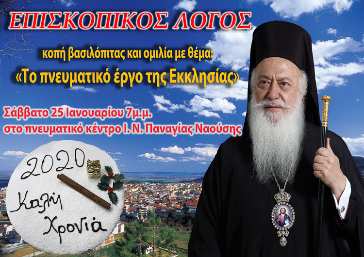 Συγκεκριμένα, το Σάββατο 25 Ιανουαρίου στις 7:00 μ.μ. ο Σεβασμιώτατος Μητροπολίτης θα ευλογήσει τη βασιλόπιτα και θα ομιλήσει με θέμα, «Το πνευματικό έργο της Εκκλησίας» στο Πνευματικό Κέντρο του Ιερού Ναού Κοιμήσεως της Θεοτόκου Ναούσης στο πλαίσιο των συνάξεων με τίτλο «Επισκοπικός Λόγος»