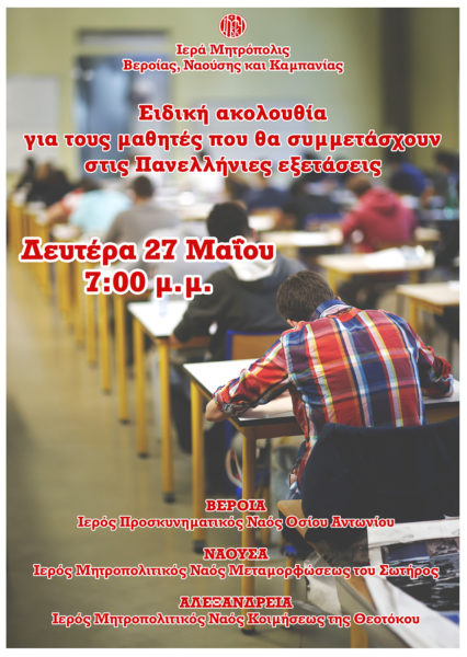 Η ειδική ακολουθία για τους μαθητές που θα συμμετάσχουν στις Πανελλήνιες εξετάσεις θα τελεστεί τη Δευτέρα 27 Μαΐου στις 7:00 μ.μ..