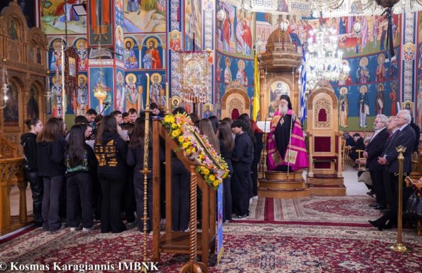Απόψε είχαμε τη χαρά να υμνήσουμε την Παναγία μας μαζί με τους μαθητές, τις μαθήτριες και τους καθηγητές του Μουσικού Σχολείου Δράμας, τους οποίους και ευχαριστούμε από καρδίας θερμά για την παρουσία τους και τις μελωδικές φωνές τους. Ιδιαιτερως ευχαριστούμε τον πρωτοψάλτη κ. Νικόλαο Στεφανάκη και τον κ. Κωνσταντίνο Παυλίδη, και τους συνοδούς καθηγητές, τον κ. Λεωνιδα Μαρκόπουλο και την κ. Ελένη Ερίκη, και εύχομαι να σας προστατεύει και να σας ευλογεί η Παναγία μας. Και να την ψάλλετε όσο υπάρχετε. Είναι μεγάλη ευλογία να έχουμε τη δύναμη να ψάλλουμε την Κυρία Θεοτόκο, την Παναγία μας. Ο Θεός και η Παναγία να είναι μαζί σας.