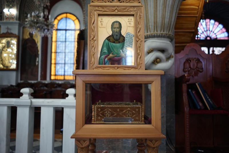 Πάνω σε αυτήν ο Αρχιμανδρίτης Στέφανος Τσιχλής, προιστάμενος του Ναού, αργότερον έγραψε: «Η πάνσεπτος Κάρα του νέου Ιερομάρτυρος Σταματίου Πρεσβυτέρου της Εκκλησίας Αγίου Γεωργίου Βροντάδου της Χίου, ευρόντος φρικτόν μαρτυρικόν θάνατον εν αυτώ τω Ναώ υπό των απίστων Αγαρηνών εν ω ετέλει την Θείαν Μυσταγωγίαν, μη θελήσαντος να την αφήση ατελείωτον εν γνώσει του μέλλοντος τέλους αυτού 1822».