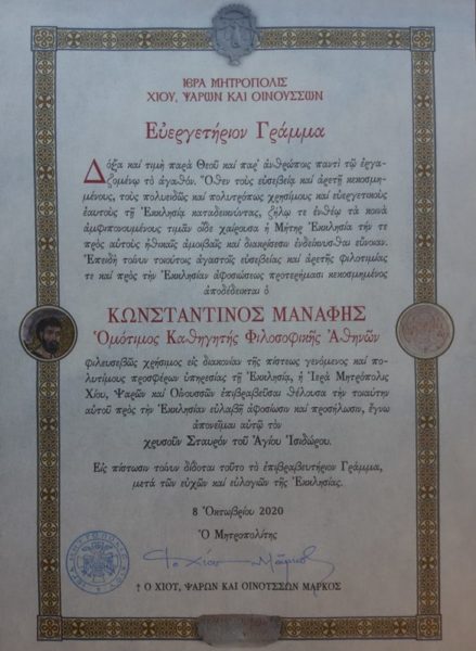 Με τον Χρυσό Σταυρό του Αγίου Ισιδώρου της Ιεράς Μητροπόλεως Χίου βράβευσε ο Σεβασμιώτατος Μητροπολίτης κ. Μάρκος τον Πρόεδρο της Εταιρείας Βυζαντινών Σπουδών κ. Κωνσταντίνο Α. Μανάφη για την προσφορά του στην Εκκλησία.