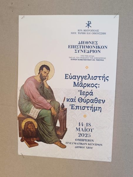 Ξεκίνησαν χθες Τετάρτη 14 Μαϊου οι εργασίες του Διεθνούς Επιστημονικού Συνεδρίου με θέμα “Ευαγγελιστής Μάρκος: Ιερά καί θύραθεν Επιστήμη”, που διοργανώνει η Ιερά Μητρόπολις Χίου, Ψαρρών και Οινουσσών στο “Ομήρειον” Πνευματικό κέντρο του Δήμου Χίου.