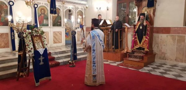 Κατά τον Αρχιερατικό Μέγα Εσπερινό, εχοροστάτησε ο Σεβασμιώτατος Μητροπολίτης Χίου κ. Μάρκος, πλαισιούμενος από τον Αιδεσιμολ. Πρωτοπρεσβύτερο κ. Δημήτριο Φώτη, Γραμματέα της Ιεράς Μητροπόλεως Χίου, Ψαρών και Οινουσσών, τον Αιδεσιμ. Πρωτοπρεσβύτερο κ. Ιωάννη Μουσά, Προϊστάμενο του Ι. Μητροπολιτικού Ναού Χίου και τον Ιερολ. Αρχιδιάκονο κ. Απόστολο Λάρδα, και με τη συμμετοχή του κ. Δημητρίου Δημητρακοπούλου, Πρωτοψάλτη του Ι. Μητροπολιτικού Ναού Χίου και του κ. Αντωνίου Κυδώνη, Λαμπαδάριου αυτού.