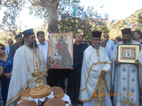 Ἀκολούθως, τό Ἱερό Λείψανο μετεφέρθη στόν πανηγυρίζοντα Ἱερό Ναό Ἁγ. Ἰωάννου Προδρόμου Πυραμᾶς, ὅπου ἤδη εὑρίσκετο ὁ Σεβασμιώτατος Μητροπολίτης Χίου, ὁ ὁποῖος ὑπεδέχθη τό Ἱερόν Λείψανον καί ἐτέλεσε Μέγαν Ἀρχιερατικόν Ἑσπερινόν. Στή συνέχεια, ἐπραγματοποιήθη Ἱερά Ἀγρυπνία καί τήν ἑπομένη, 29 Αὐγούστου, ἐτελέσθη Ἀρχιερατικός Ὄρθρος καί Ἀρχιερατική Θ. Λειτουργία, ἱερουργοῦντος τοῦ Χίου Μάρκου. Τόν Θ. Λόγον ἐκήρυξεν ὁ Κήρυξ τοῦ Θ. Λόγου Ἀν/χης (ΠΖ) Δημήτριος Τσαφούλης, ὁ ὁποῖος, μέ ἐμπνευσμένο λόγο, εἶπε: