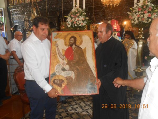 Μετακομίζεται τὸ Ἅγιον τῆς Ἐκκλησίας τοῦτο Κειμήλιον, ἀπὸ τὴν πατρίδα τῶν Ἐθνομαρτύρων Καραολῆ καὶ Δημητρίου καὶ τοῦ ἀναρριχητοῦ εἰς τάς κορυφάς τῆς ἐλευθερίας Εὐαγόρου Παλληκαρίδου, εἰς τὴν πατρίδα τὴν ὁποίαν ὁ Κωνσταντῆς Κανάρης ἐτίμησε διὰ τοῦ ἡρωισμοῦ του.