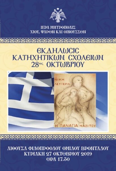 28/10/2019 28/10/2019 Μέ συμμετοχή μεγάλου ἀριθμοῦ παιδιῶν ἀπό τά Κατηχητικά Σχολεῖα τῆς Ἱερᾶς Μητροπόλεως Χίου, καθώς καί τῶν μεγαλυτέρων τῆς Κατασκηνώσεως «ΤΟ ΚΑΡΑΒΙ ΤΟΥ ΧΡΙΣΤΟΥ» ἐτίμησε ἡ Ἐκκλησία τῆς Χίου τήν ἑορτή τῆς 28ης Ὀκτωβρίου 1940. Στήν ἀσφυκτικά γεμάτη αἴθουσα τοῦ Φιλοπροόδου Ὁμίλου Βροντάδου (Φ.Ο.Β.) πού φιλόξενα παραχωρήθηκε ἀπό τόν Πρόεδρο κ. Πολύδωρο Στεῖρο καί ἐνώπιον τοπικῶν...