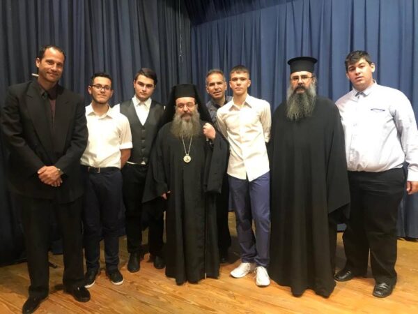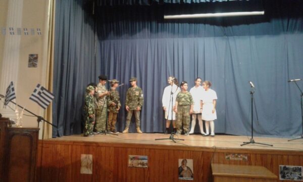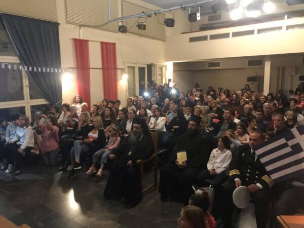 Στήν ἀσφυκτικά γεμάτη αἴθουσα τοῦ Φιλοπροόδου Ὁμίλου Βροντάδου (Φ.Ο.Β.) πού φιλόξενα παραχωρήθηκε ἀπό τόν Πρόεδρο κ. Πολύδωρο Στεῖρο καί ἐνώπιον τοπικῶν Ἀρχῶν τό ἀπόγευμα τῆς Κυριακῆς 27ης Ὀκτωβρίου 2019,τά παιδιά καί οἱ κατηχητές τους παρουσίασαν ἕνα δίωρο πρόγραμμα μέ θεατρικά σκέτς, ἀπαγγελίες καί τραγούδια ἐκκλησιαστικοῦ καί ἱστορικοῦ περιεχομένου. Ἰδιαιτέρως καθήλωσαν τό ἀκροατήριο τά δρώμενα πού παρουσίαζαν τόν ἐθνικό μας ποιητή Κωστή Παλαμᾶ νά λέγει τό μήνυμά του γιά τήν 28η Ὀκτωβρίου καί τόν μεγάλο ποιητή Ἄγγελο Σικελιανό νά ἀπαγγέλει τό ἐπιτάφιο ποίημά του γιά τόν Παλαμᾶ.