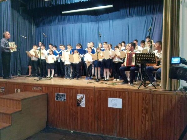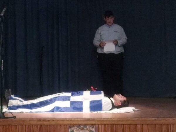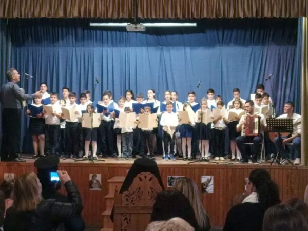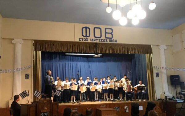 Στήν ἀσφυκτικά γεμάτη αἴθουσα τοῦ Φιλοπροόδου Ὁμίλου Βροντάδου (Φ.Ο.Β.) πού φιλόξενα παραχωρήθηκε ἀπό τόν Πρόεδρο κ. Πολύδωρο Στεῖρο καί ἐνώπιον τοπικῶν Ἀρχῶν τό ἀπόγευμα τῆς Κυριακῆς 27ης Ὀκτωβρίου 2019,τά παιδιά καί οἱ κατηχητές τους παρουσίασαν ἕνα δίωρο πρόγραμμα μέ θεατρικά σκέτς, ἀπαγγελίες καί τραγούδια ἐκκλησιαστικοῦ καί ἱστορικοῦ περιεχομένου. Ἰδιαιτέρως καθήλωσαν τό ἀκροατήριο τά δρώμενα πού παρουσίαζαν τόν ἐθνικό μας ποιητή Κωστή Παλαμᾶ νά λέγει τό μήνυμά του γιά τήν 28η Ὀκτωβρίου καί τόν μεγάλο ποιητή Ἄγγελο Σικελιανό νά ἀπαγγέλει τό ἐπιτάφιο ποίημά του γιά τόν Παλαμᾶ.