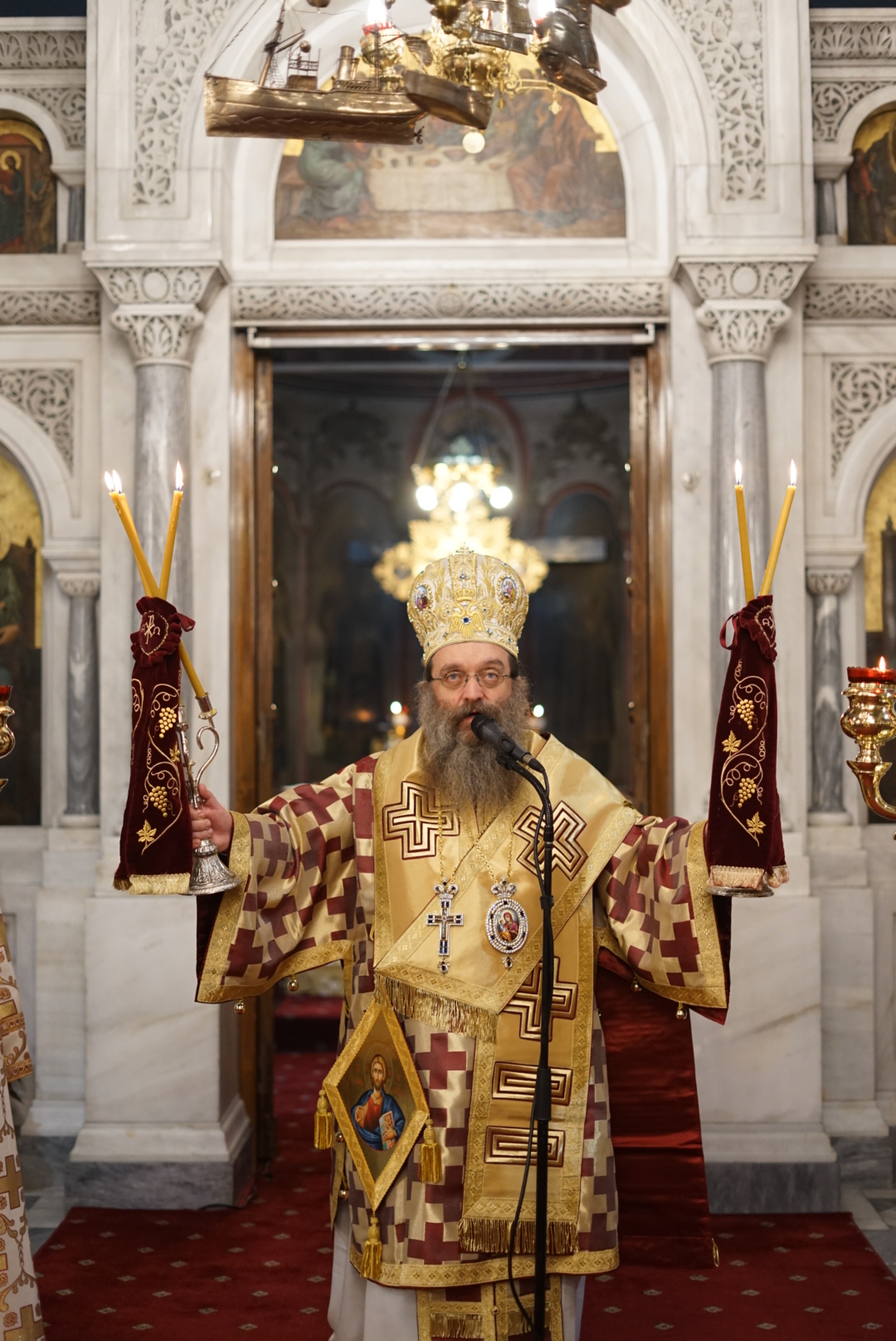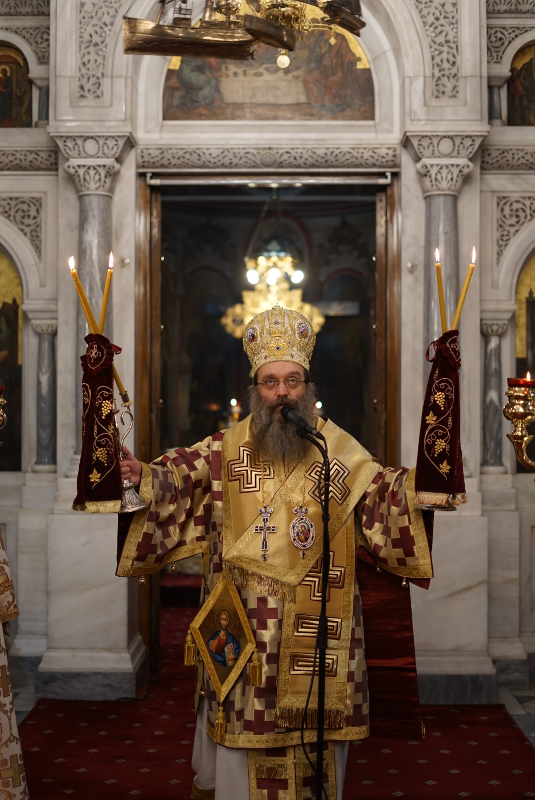 Πρό τὴς ἀπολύσεως εὐχήθηκε γιά τόν Ἱερό Κλῆρο καί τόν πιστό λαό, γιά τίς Ἔνοπλες Δυνάμεις, κυρίως τούς στρατιῶτες τῆς Νησίδος τῆς Παναγιᾶς, τήν νεολαία, τούς ἀσθενεῖς, τούς ἰατρούς καί νοσηλευτές, τήν ἐκπαιδευτική κοινότητα, τόν πληττόμενο ἐμπορικό κόσμο καί ἰδιαιτέρως, μέ ἐμφανῆ συγκίνηση, τούς Ναυτικούς μας, οἱ ὁποῖοι ὡς ἄστρα συνθέτουν τό λαμπρό ἀστέρι τῆς πρυτανεύουσας ἀνά τήν Οἰκουμένη Ἑλληνικῆς Ἐμπορικῆς Ναυτιλίας.