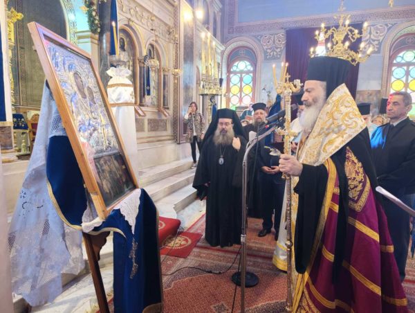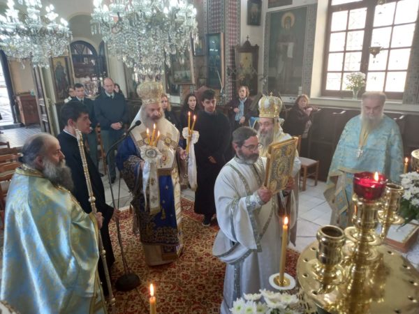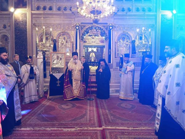 Εν συνεχεία οι δύο Ιεράρχες μετέβησαν στον Ιερό Μητροπολιτικό Ναό Χίου όπου έγινε η υποδοχή της Ιεράς Εικόνος Παναγίας Πλακιδιωτίσσης από την ομώνυμη Μονή της Καλλιμασιάς. Έγινε δέηση και ο Σεβασμιώτατος Χίου είπε: