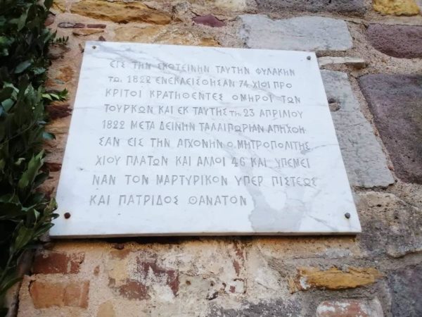 Στο φρούριο της Χίου τελέσθηκε Θεία Λειτουργία στη μνήμη των ιερομαρτύρων της Σφαγής της Χίου καθώς φέτος συμπληρώθηκαν 200 χρόνια από το μαρτυρικό θάνατό τους. Η Θεία Λειτουργία τελέσθηκε την Κυριακή 4 Σεπτεμβρίου 2022 μέσα στην Σκοτεινή Φυλακή του Φρουρίου της Χίου, στον ίδιο ακριβώς χώρο όπου ο Άγιος Ιερομάρτυς Πλάτων Μητροπολίτης Χίου, ο Άγιος Ιερομάρτυς Μακάριος ο Αρχιδιάκονος και οι πρόκριτοι του νησιού εφυλακίσθησαν πριν να οδηγηθούν στον δι’αγχόνης θάνατο.