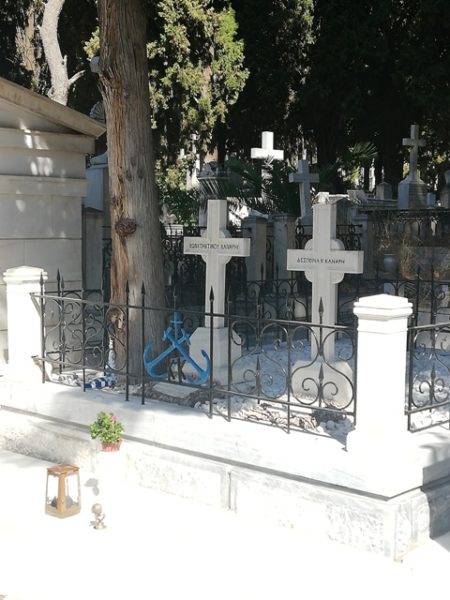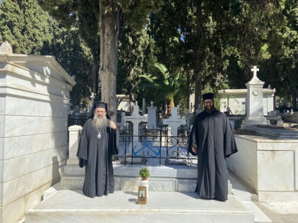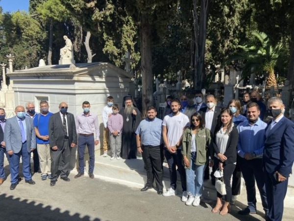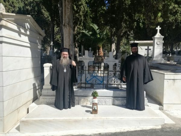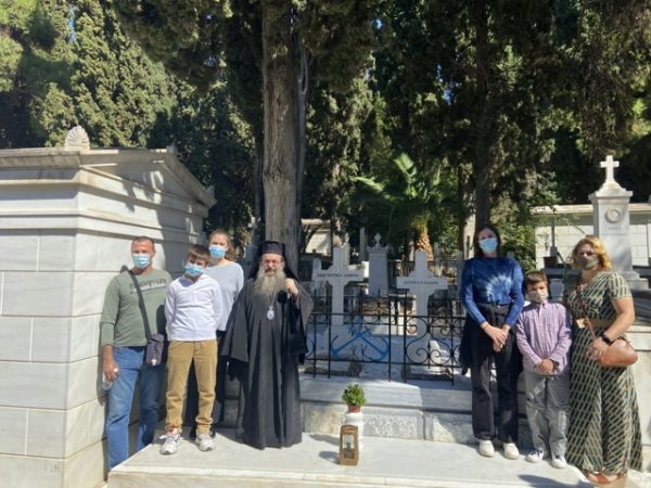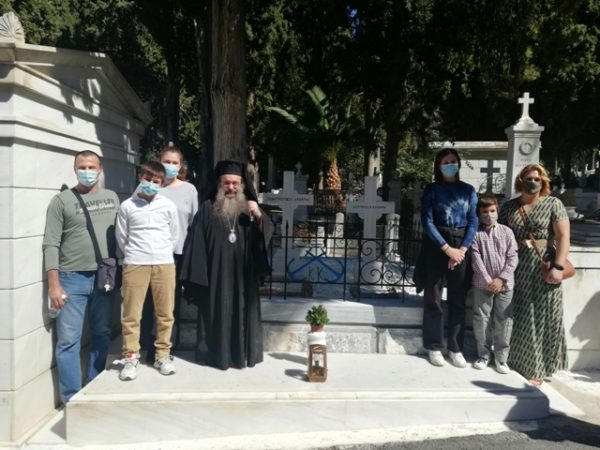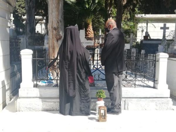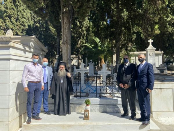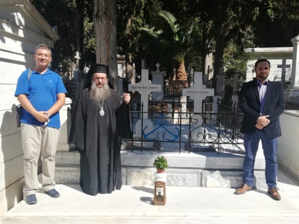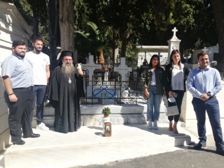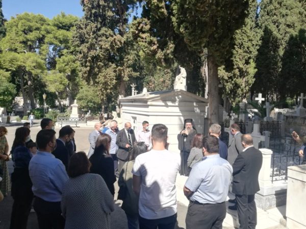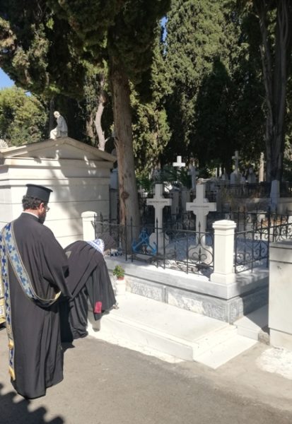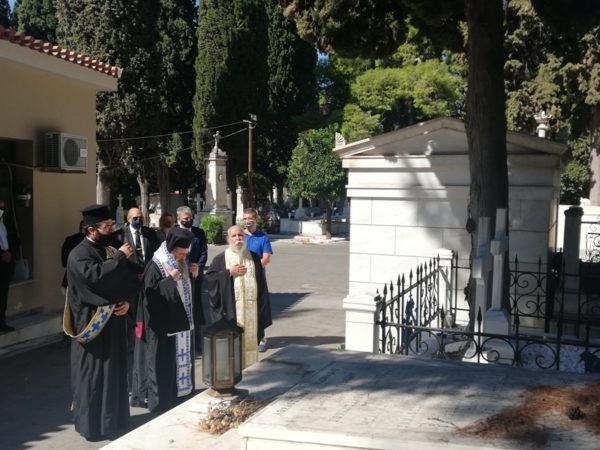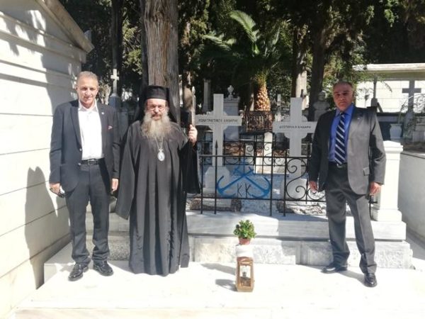 Μετά το πέρας της Θ. Λειτουργίας και τον Εθνικό Ύμνο, όλοι μετέβησαν στο Α΄ Κοιμητήριο Αθηνών, όπου ο Χίος Ιεράρχης τέλεσε “Τρισάγιο” στους τάφους του Κωνσταντή και της Δεσποίνης Κανάρη.