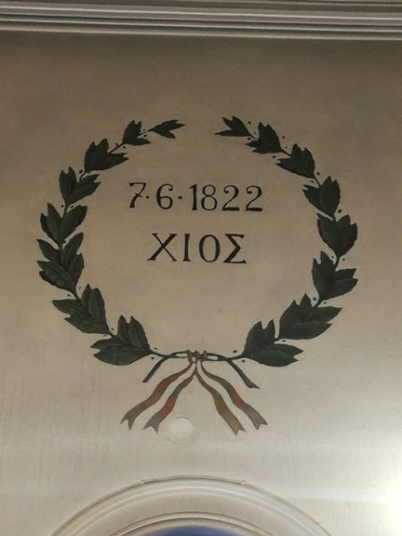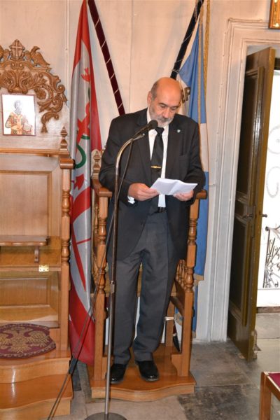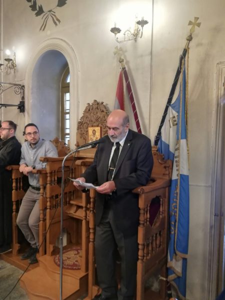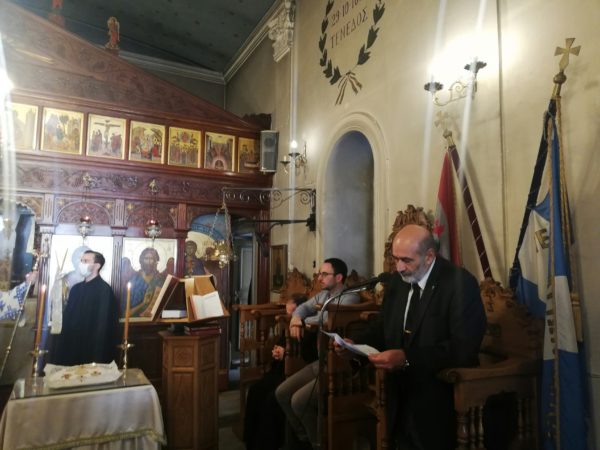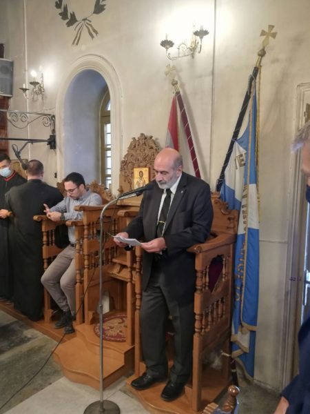 Μετά το Μνημόσυνο, ο Ενδοξώτατος Ναύαρχος Π.Ν. κ. Κοσμάς Χρηστίδης, Επίτ. Αρχηγός ΓΕΝ, ανέβηκε με προτροπή του Σεβασμιωτάτου Χίου στο στασίδι του Κανάρη και, φανερά συγκινημένος και ένδακρυς, εκφώνησε τον εξής λόγο: