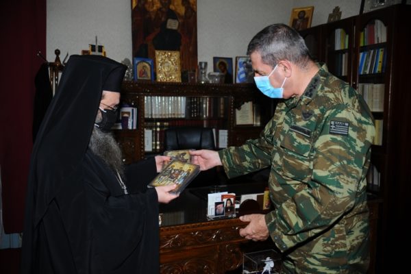 Προσέφερε δε μεταξύ άλλων στον κ. Αρχηγό ως δώρο μια Καινή Διαθήκη και δυο εικόνες στρατιωτικών Αγίων της Χίου, ενημερώνοντας ότι η Ιερά Μητρόπολις Χίου καθιερώνει από το επετειακό έτος 2021 τον εορτασμό όλων των στρατιωτικών Αγίων κατά μήνα Νοέμβριο και ως απάντηση στην πρόκληση των “εχθρών του Ευαγγελίου”(Ανδρέας Κάλβος) για αποστρατιωτικοποίηση των νησιών.