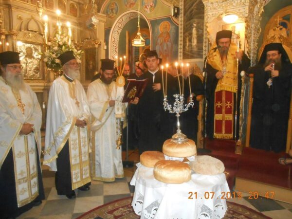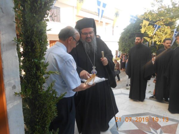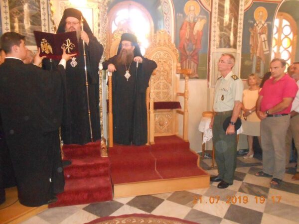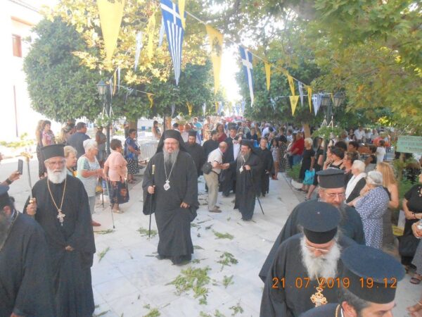 Τή Δευτέραν 22α Ἰουλίου 2019, ἐτελέσθη ἡ Πολυαρχιερατική Θεία Λειτουργία, προεξάρχοντος τοῦ Σεβ. Μητροπολίτου Λαρίσης καί Τυρνάβου κ. Ἱερωνύμου καί συλλειτουργοῦντος τοῦ Σεβ. Μητροπολίτου Χίου, Ψαρῶν καί Οἰνουσσῶν κ. Μάρκου. Τόν Θεῖο Λόγο ἐκήρυξε καταλλήλως ὁ Σεβ. Μητροπολίτης Λαρίσης καί Πλαταμῶνος κ. Ἱερώνυμος ἀναφερόμενος εἰς τήν Εὐαγγελικήν περικοπήν τῆς ἡμέρας [τῆς αἱμορροούσης] (Μαρκ. ε΄ 24-34).