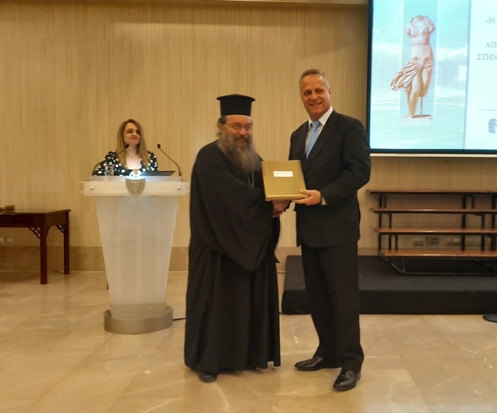 Πρίν ἀπό τήν εἰσήγησή του ὁ Σεβασμιώτατος ἐτιμήθη ἀπό τόν κ. Ὑπουργό Παιδείας τῆς Κυπριακῆς Δημοκρατίας μέ εἰδική πλακέτα”.