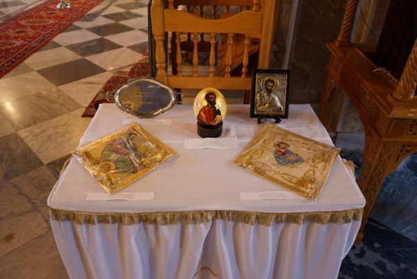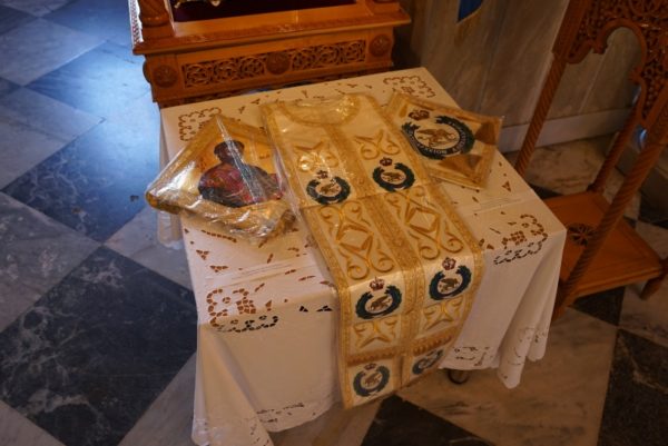 Μεταξύ άλλων, παρουσίασε εικόνα του Αγίου αγιογραφηθείσα το 1831 από τον Ματθαίο Λεγάτο, Σταυρό και Εγκόλπιο εκ του Πατριαρχείου Αλεξανδρείας, παράσημον του Αλεξανδρινού Θρόνου, με τον λέοντα του Αγίου Μάρκου, φωτογραφίαν ανεκδότων Κανόνων εκ των Κωδίκων του Σινά, τα οποία ήρχισεν να εκδίδει από πέρυσι ο Σεβασμιώτατος, βιβλία Καθηγητών του Πανεπιστημίου του Χάρβαρντ, μετάφρασιν του Κατά Μάρκον Ευαγγελίου εις ιαμβικόν μέτρον και χιακήν διάλεκτον, αγιογραφηθέντα και κεντημένα επιγονάτια, δίσκους κ.α.