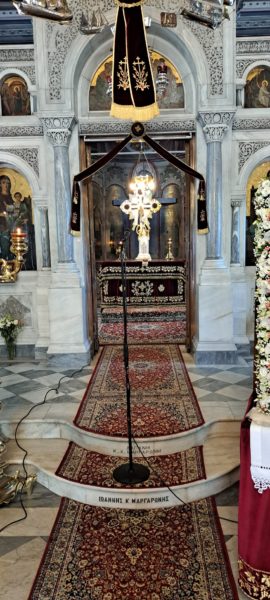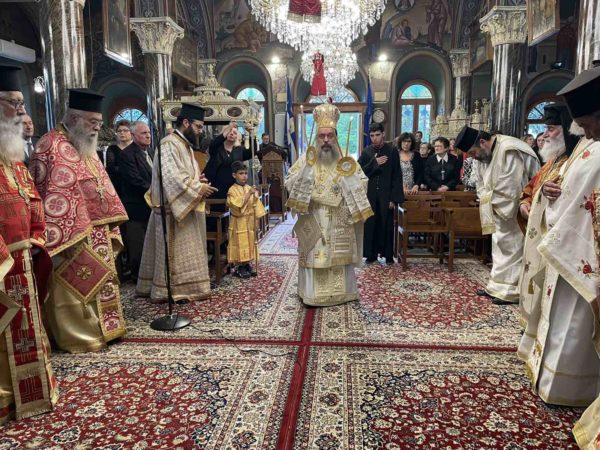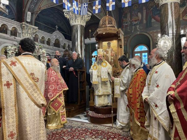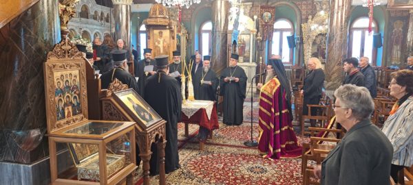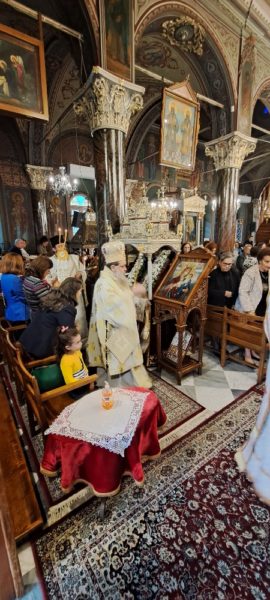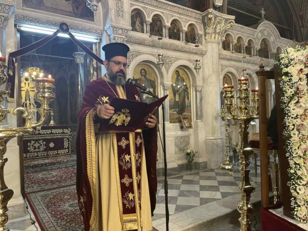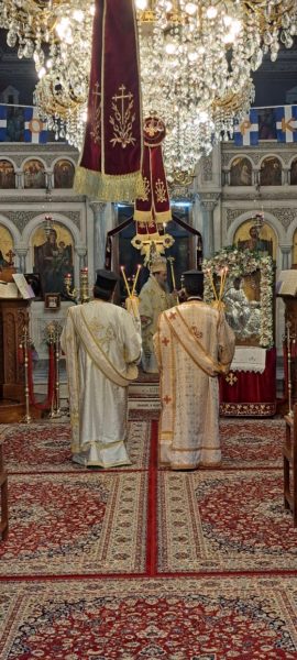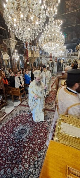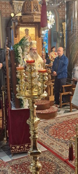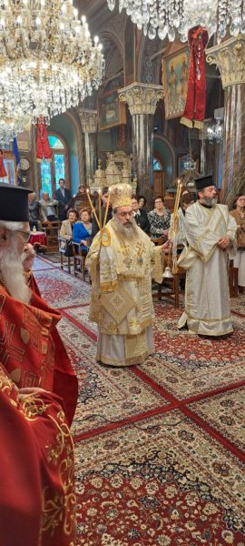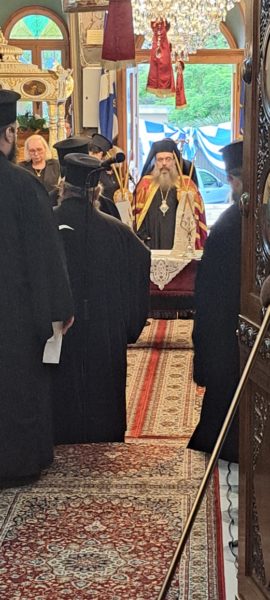 Κατά την εκκλησιαστική τάξη, ο Σεβασμιώτατος Μητροπολίτης Χίου, Ψαρών και Οινουσσών κ. Μάρκος ενεδύθη τα Αρχιερατικά του Άμφια στο μέσο του Ιερού Ναού, με την συμμετοχή του συνόλου σχεδόν του Ιερού Κλήρου της Ιεράς Μητροπόλεως, του Αρχιδιακόνου κ. Αποστόλου Λάρδα, του Διακόνου κ. Κωνσταντίνου Καραμπουρνιώτης, όλων των Ιερέων, πολλών Ιεροψαλτών, οι οποίοι πλαισίωσαν τους Ιεροψάλτες του Ιερού Ναού στον κατάμεστο από πιστούς Ιερό Ναό και μάλιστα από νέους.